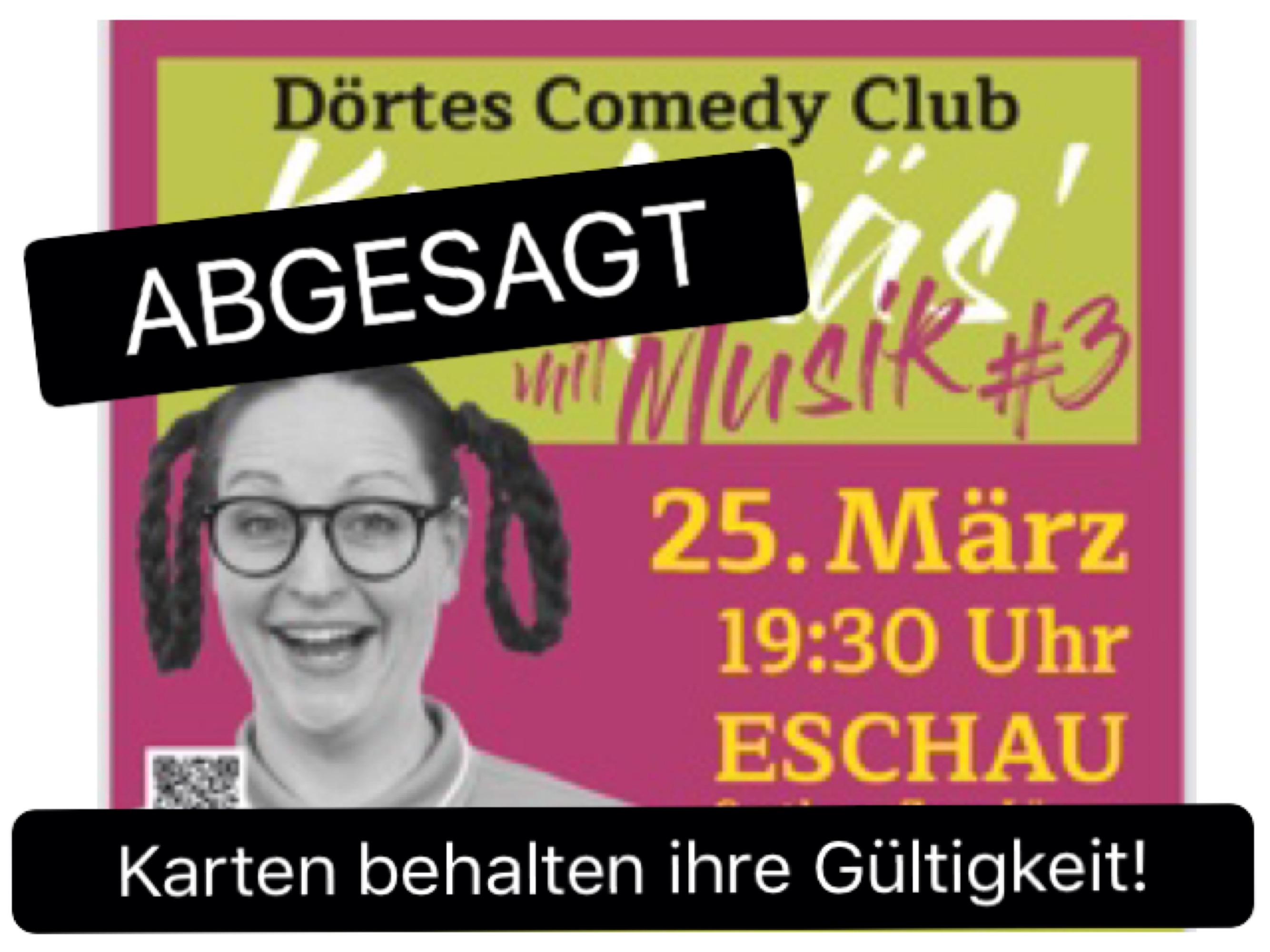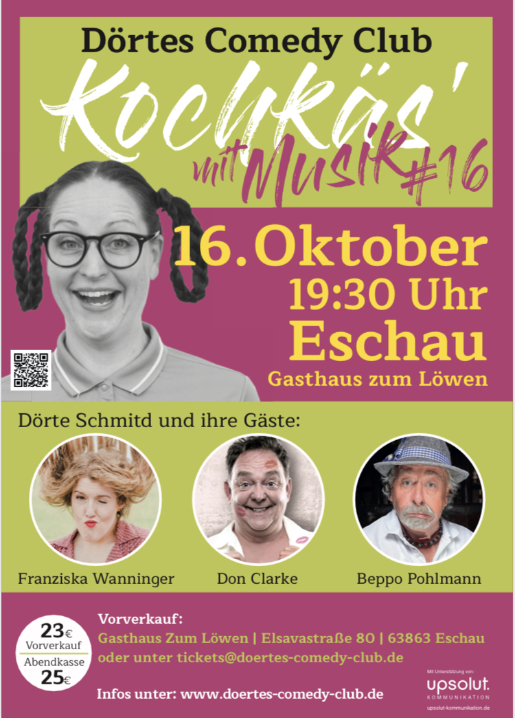 Die Karten behalten Ihre Gültigkeit. Sie können entweder online unter tickets@doertes-comedy-club.de oder im Gasthaus zum Löwen für den 20.Mai ( oder gegen einen Gutschein) umgetauscht werden.